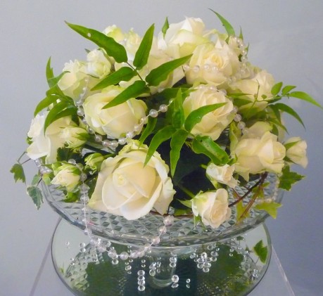 Large headed ‘Avalanche’ roses, small spray ‘Snowflake’ roses and pearls with jasmine foliage were used to make this vintage style centrepiece.