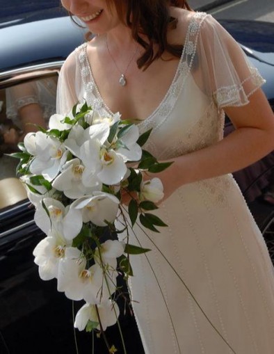 A sophisticated white orchid bouquet; crystals have been wired into this design, they will catch the light and sparkle as the bride moves. This bouquet best suits dresses the long trains, full skirts and tend to be very formal.