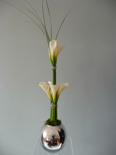 90cm Tall arum lilies were used to create this sophisticated and stylish arrangement- pictured in a mirrored bubble bowl with tall steel grass.