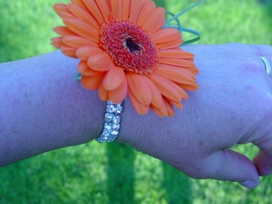 Minimalist chic – diamante bracelet with a bright orange gerbera. Suitable for a bridesmaid.