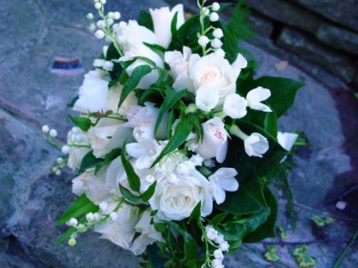 A loose traditional bridal bouquet of scented ‘Margaret Merrill’ garden roses, lily of the valley, and stephanotis florets, with dark green ivy and jasmine foliage. Stems are completely covered in white sheer voile ribbon.